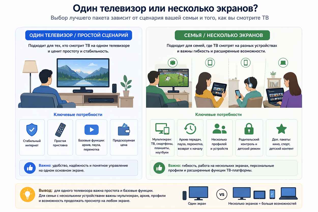 В таком сценарии сильнее выглядят пакеты, где есть мультиэкран, Smart TV, дополнительные устройства и понятная логика мультирума. Здесь уже важна не только приставка на одном телевизоре, а то, насколько удобно смотреть контент всей семье на разных экранах.